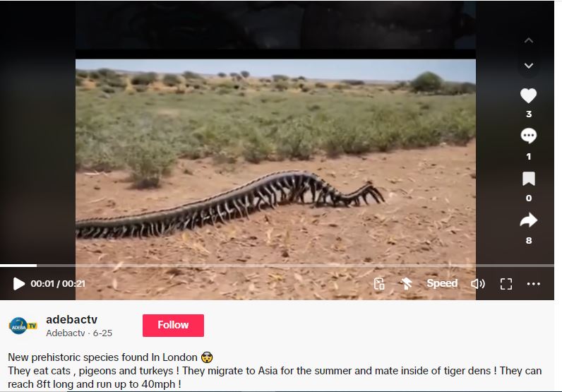 منذ ايام، ينتشر الفيديو على نطاق واسع، بلغات عدة. المشاهد تظهر حيوانا طويلا يتنقل على عشرات الارجل، بأحجام مختلفة. وقد ارفقتها حسابات بالمزاعم الآتية (من دون تدخل): "أصبح التغير المناخي مناسب للزواحف. فيديو يوثق حجم أم اربع واربعين رُصدت في أوستراليا"، وايضا "صنف من حيوانات العصور ما قبل التاريخ في لندن". وابدى مستخدمون استغرابهم، قائلين انهم لم يشاهدوا من قبل هذا النوع من الحيوانات الذي "يبلغ طوله 8 اقدام". وتساءلوا عن ماهيته.