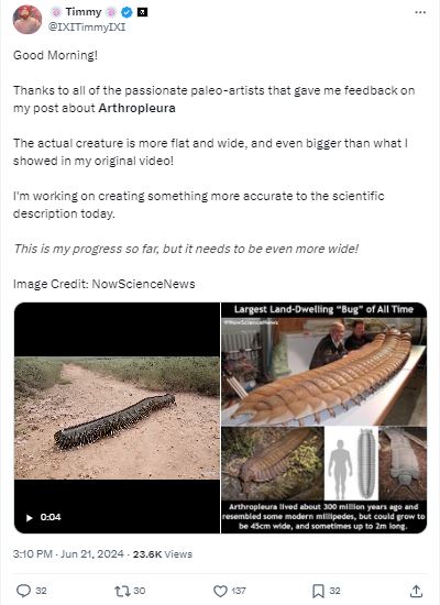 وبعد يوم، في 21 حزيران 2024، اعاد IXITimmyIXI@ نشر فيديو آخر (هنا) مع تعليق شكر فيه "تعليقات على منشوره حول الأرثروبيليورا". وقال: "المخلوق الفعلي مسطح وعريض أكثر، وأكبر حتى مما أظهرته في الفيديو الأصلي الخاص بي. وأعمل على ابتكار شيء أكثر دقة للوصف العلمي حالياً. هذا هو التقدم الذي أحرزته حتى الآن، لكنه يحتاج إلى أن يكون (المخلوق) أكثر عرضاً".
