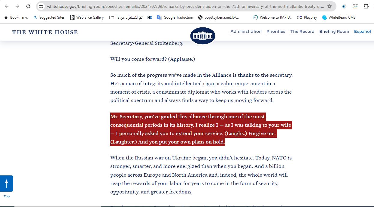 وبمراجعة الفيديو بتمعن، وايضا النص الكامل لخطاب بايدن الذي نشره البيت الابيض، يتبيّن ان بايدن قال: "سيدي الأمين العام، لقد قمت بتوجيه هذا التحالف خلال واحدة من أهم الفترات في تاريخه. أدرك أنني - بينما كنت أتحدث إلى زوجتك - طلبت منك شخصيا تمديد خدمتك. سامحني. لقد عمدت الى تأجيل خططك الخاصة...".