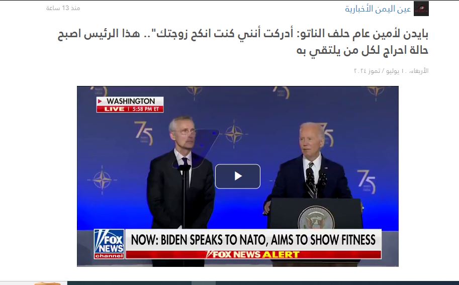 15 ثانية فقط. المشاهد تظهر الرئيس الاميركي متكلما، الى جانبه الأمين العام لحلف شمال الأطلسي ينس ستولتنبرغ، وبدت خلفهما خلفية زرقاء ظهر عليها شعار حلف شمال الاطلسي ورقم 75. وقد تكثف التشارك في الفيديو أخيرا عبر مواقع وحسابات، عربية وأجنبية، ارفقته بالمزاعم الآتية: "بايدن لأمين عام حلف الناتو: أدركت أنني كنت انكح زوجتك. هذا الرجل اصبح حالة احراج عالمية".