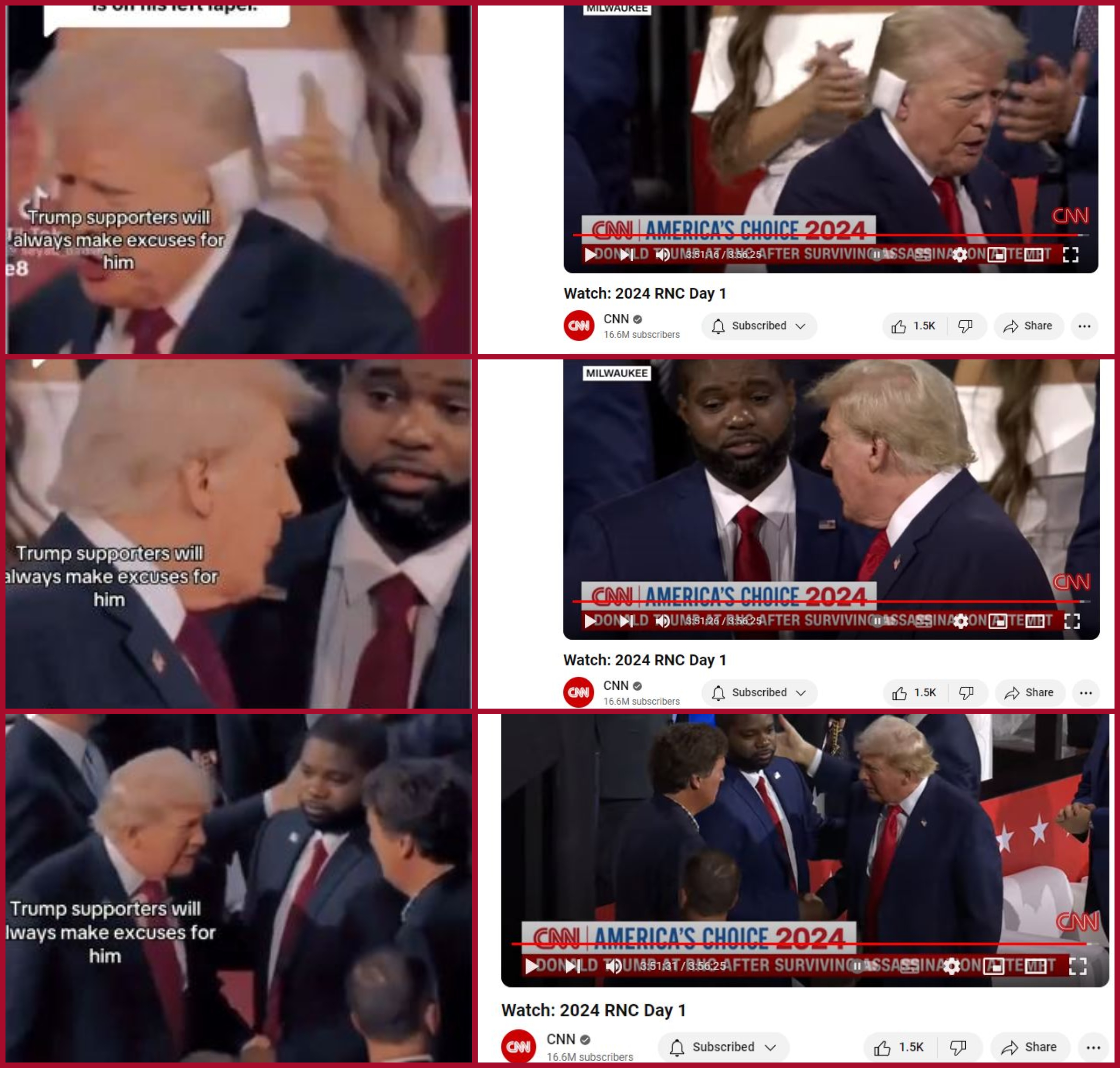 والدليل على زيفها عثورنا على المشاهد الاصلية (ابتداء من التوقيت: 3:51:15) عرضتها شبكة "سي أن أن" الاميركية، في حسابها في يوتيوب، في 16 تموز 2024، لوقائع اليوم الاول لمؤتمر الحزب الجمهوري الذي انعقد في ميلووكي الاثنين 15 منه.