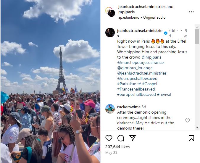 فالبحث عنه، بتجزئته الى مشاهد ثابتة (Invid)، يوصلنا الى خيوط تقودنا الى مصدره الاصلي، حساب المبشّر جان لوك تراكسل- Jean-Luc Trachsel ministries- في انستغرام، والذي نشره في 25 ايار 2024، مع تعليق: "الآن في باريس عند برج إيفل، نحضر يسوع إلى هذه المدينة. نعبده ونبشر به".