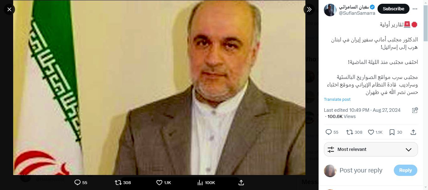 ينتشر الخبر في وسائل التواصل الاجتماعي منذ 27 آب 2024، باللغات الانكليزية والعربية والفارسية، مستقطبا اهتمام المستخدمين. وجاء فيه (من دون تدخل): "أنباء عن هروب الدكتور مجتبى أماني، سفير إيران في لبنان، إلى إسرائيل. المؤكد أن مجتبى اختفى من بيروت منذ الليلة الماضية".