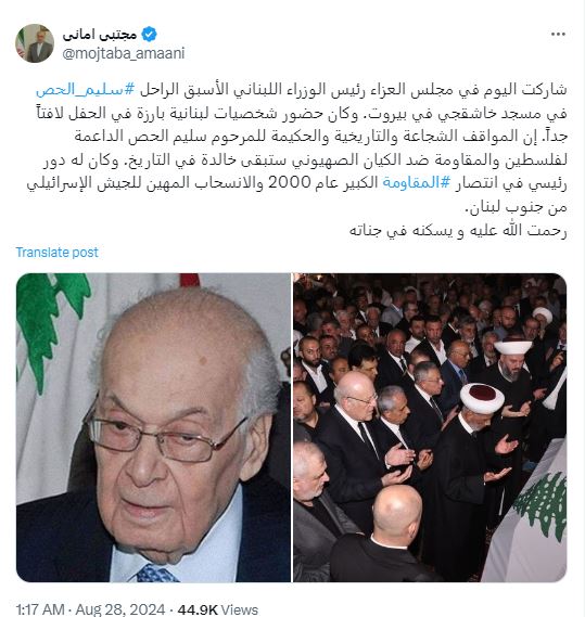 فقد ذكر في منشور، في 28 آب 2024، أنه شارك في مجلس عزاء رئيس الوزراء اللبناني الأسبق الراحل سليم الحص في مسجد خاشقجي في بيروت.