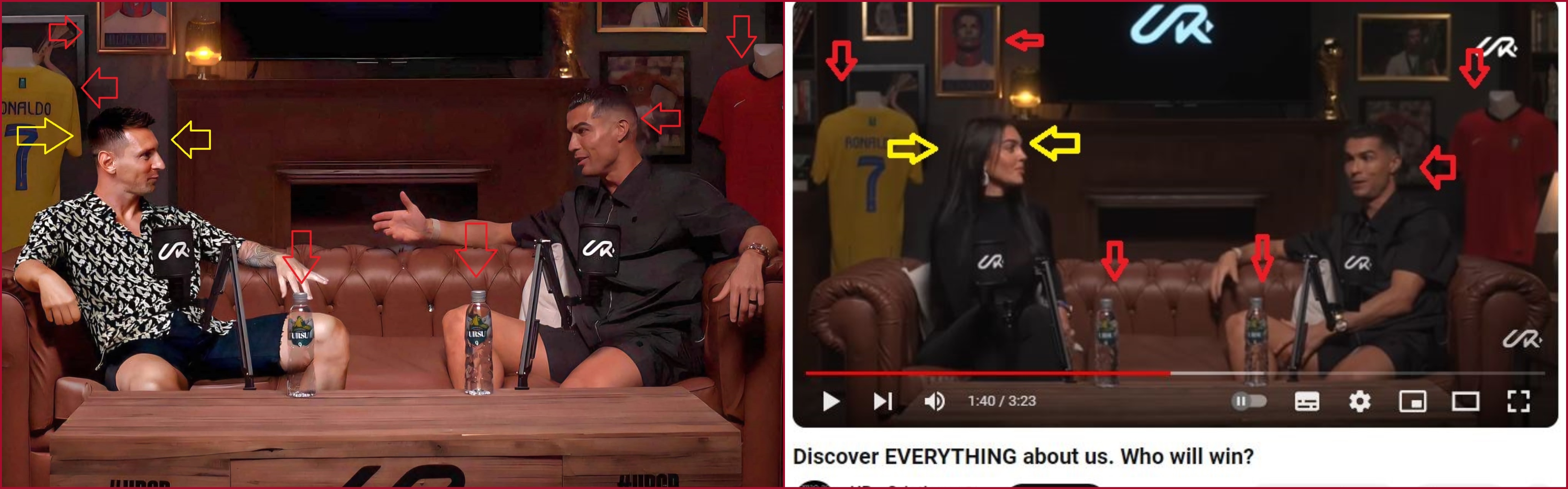 وقد أجرينا لكم مقارنة بين لقطة من البودكاست بين رونالدو وجورجينا (ادناه الى اليمين)، والصورة المركّبة (الى اليسار). واشرنا بالاحمر الى القواسم، وبالاصفر الى التلاعب الذي حصل.