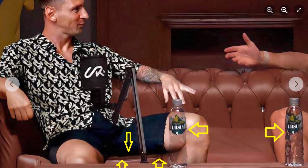 العثور على المشاهد الاصلية يعني، اذاً، اننا امام صورة متناقلة مركبة، زائفة، بحيث تمت اضافة ميسي الى الاريكة التي كان رونالدو يجلس عليها. وتفضح تفاصيل عدة في الصورة فبركة غير متقنة. انظروا الى التفاوت بين لوني القنينتين على الطاولة، ووضعية جلوس ميسي.