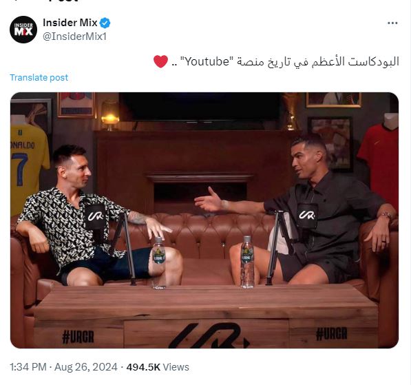 المتداول: صورة تظهر، وفقاً للمزاعم، "نجمي كرة القدم البرتغالي كريستيانو رونالدو، والارجنتيني ليونيل ميسي، خلال بودكاست هو الأعظم في تاريخ منصة يوتيوب".