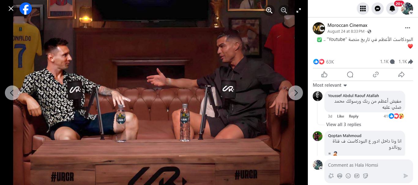 تظهر الصورة نجمي كرة القدم البرتغالي كريستيانو رونالدو والارجنتيني ليونيل ميسي، جالسين معا على أريكة، كأنهما يتبادلان الكلام. وقد تكثف التشارك فيها أخيرا عبر حسابات، عربية واجنبية، ارفقتها بالمزاعم الآتية (من دون تدخل): "البودكاست الأعظم في تاريخ منصة Youtube".