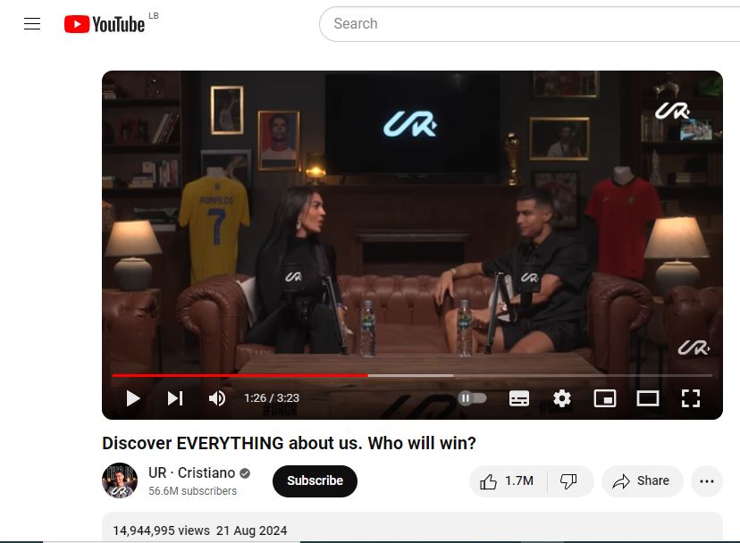 نقصد القناة فورا، حيث نقع على مشاهد يظهر فيها رونالدو بالثياب ذاتها، ووسط الديكور نفسه، خلال بودكاست جمعه بشريكته جورجينا رودريغيز. وهو منشور ابتداء من 21 آب 2024.