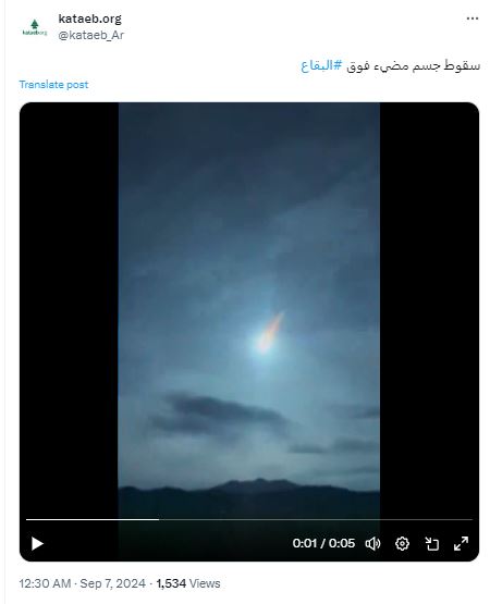 المتداول: فيديو يظهر، وفقاً للمزاعم، "نيزكا سقط في البقاع بشرق لبنان"، خلال الساعات الماضية.