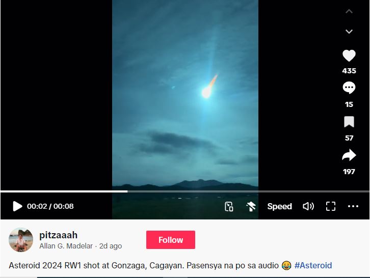 @pitzaaah Asteroid 2024 RW1 shot at Gonzaga, Cagayan. Pasensya na po sa audio 😂 #Asteroid ♬ original sound - Pet Essentials - Allan G. Madelar