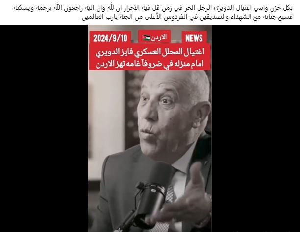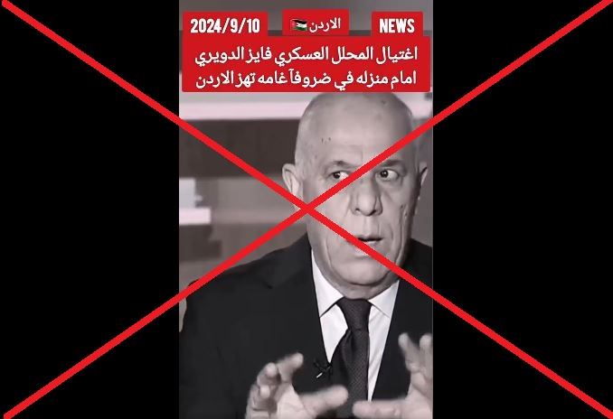 ينتشر في وسائل التواصل الاجتماعي خبر يدعي "اغتيال الخبير العسكري والاستراتيجي الاردني اللواء المتقاعد فايز الدويري في عمان"، العاصمة الاردنية. الا أن الخبر غير صحيح، وقد نفاه الدويري بنفسه، مندّدا بـ"الذباب الالكتروني ناشر الكلام الكاذب والدعاية المغرضة". FactCheck#