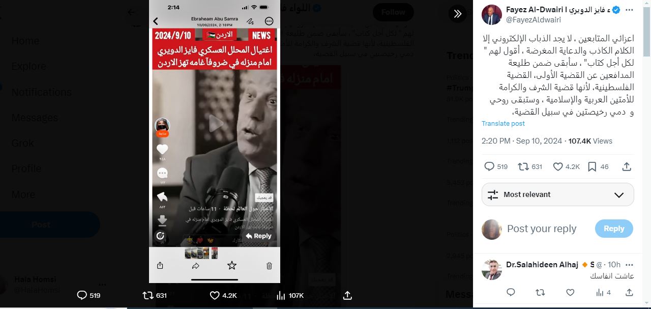 فقد نفى اللواء المتقاعد فايز الدويري خبر اغتياله، عبر حسابه في اكس، أمس الثلثاء 10 ايلول 2024. وكتب: "اعزائي المتابعين، لا يجد الذباب الإلكتروني إلا الكلام الكاذب والدعاية المغرضة. أقول لهم "لكل أجل كتاب"، سأبقى ضمن طليعة المدافعين عن القضية الأولى، القضية الفلسطينية، لأنها قضية الشرف والكرامة للأمتين العربية والإسلامية، وستبقى روحي ودمي رخيصتين في سبيل القضية".