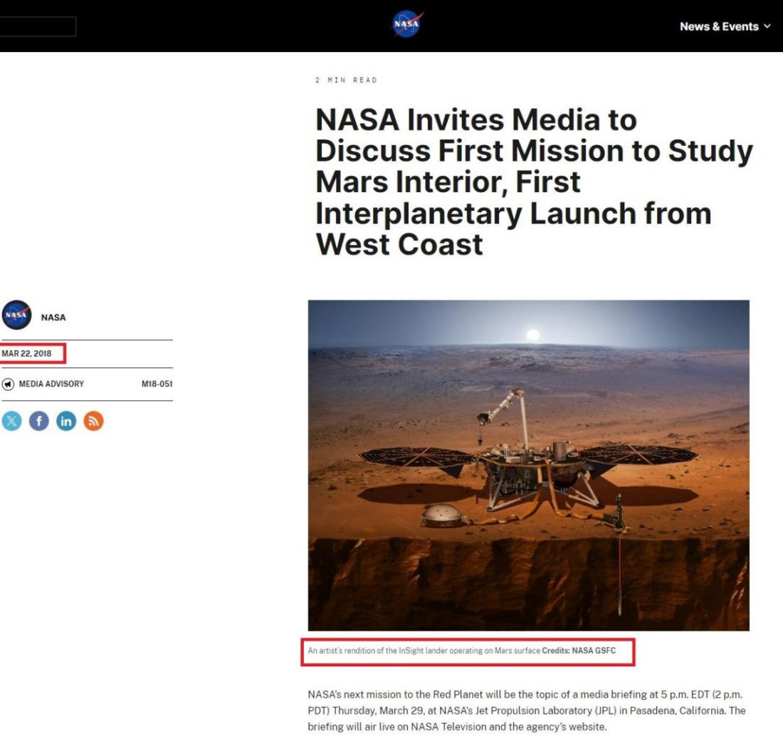 وأمكن العثور على الصورة نفسها على موقع وكالة ناسا، منشورة في 22 آذار 2018 قبل أكثر من شهر من انطلاق المهمّة، وقبل سبعة أشهر من هبوطها هناك.
