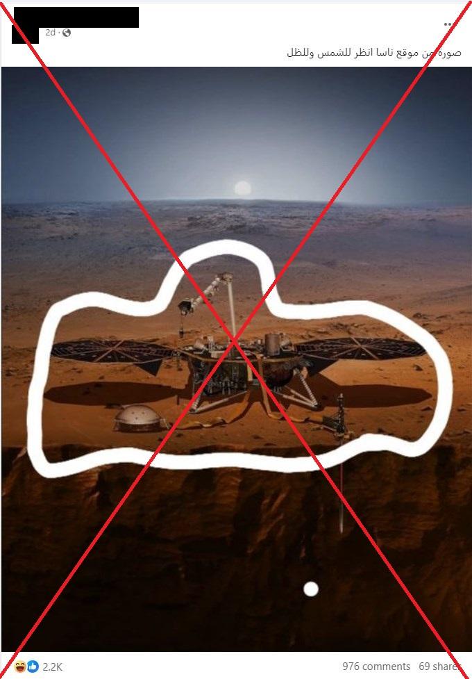 وبيّن الموقع الإلكتروني لوكالة ناسا بوضوح أنّ الصورة المنشورة ليست سوى رسم تعبيريّ مُتخيّل للمركبة "إنسايت" على سطح المرّيخ.