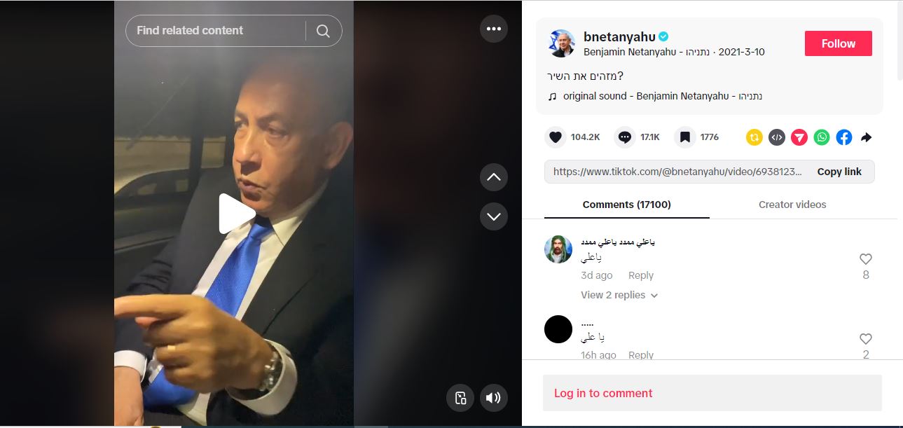 وبمراجعة مختلف حسابات نتنياهو في وسائل التواصل الاجتماعي، نقع على الفيديو منشورا في حسابه في تيك توك في 10 آذار 2021، بعنوان (ترجمة من العبرية): "هل تعرّفت على الأغنية؟".