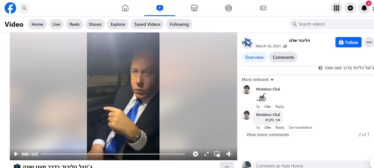 فالبحث عنه، بتجزئته الى مشاهد ثابتة (Invid)، وباستخدام كلمات مفاتيح، يوصلنا اليه أولا منشورا في هذه الصفحة في الفايسبوك في 10 آذار 2021، مع تعليق بالعبرية: "لحن (نشيد حزب) الليكود مختلف بعض الشيء".