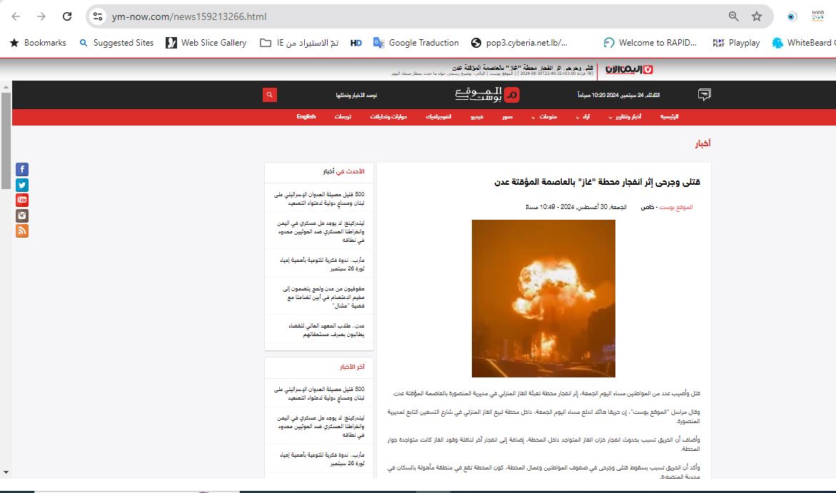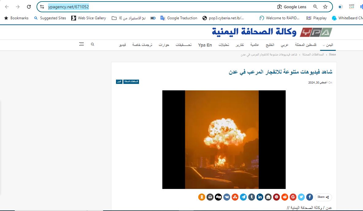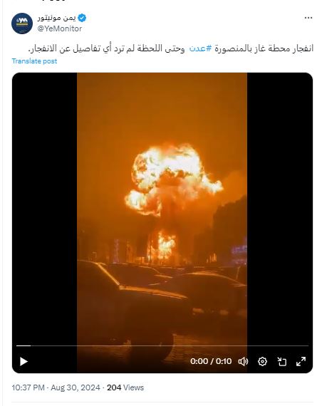 فالبحث عنه، بتجزئته الى مشاهد ثابتة (Invid)، يوصلنا الى مواقع اخبارية، لا سيما يمنية، وحسابات نشرته او نشرت لقطات ثابتة منه في 30 (31) آب 2024، بكونه يعود الى انفجار في محطة غاز بالمنصورة في عدن باليمن.
