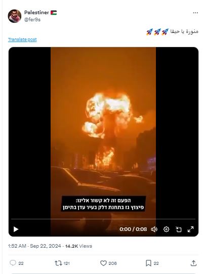 النتيجة: اذاً، لا صحة للمزاعم ان الفيديو المتناقل يظهر "حيفا في شمال اسرائيل وهي تحترق" من جراء صواريخ حزب الله. في الواقع الفيديو قديم، اذ يعود الى 31 آب 2024. ويظهر نيرانا مشتعلة من جراء انفجار في محطة غاز بالمنصورة في عدن باليمن.
