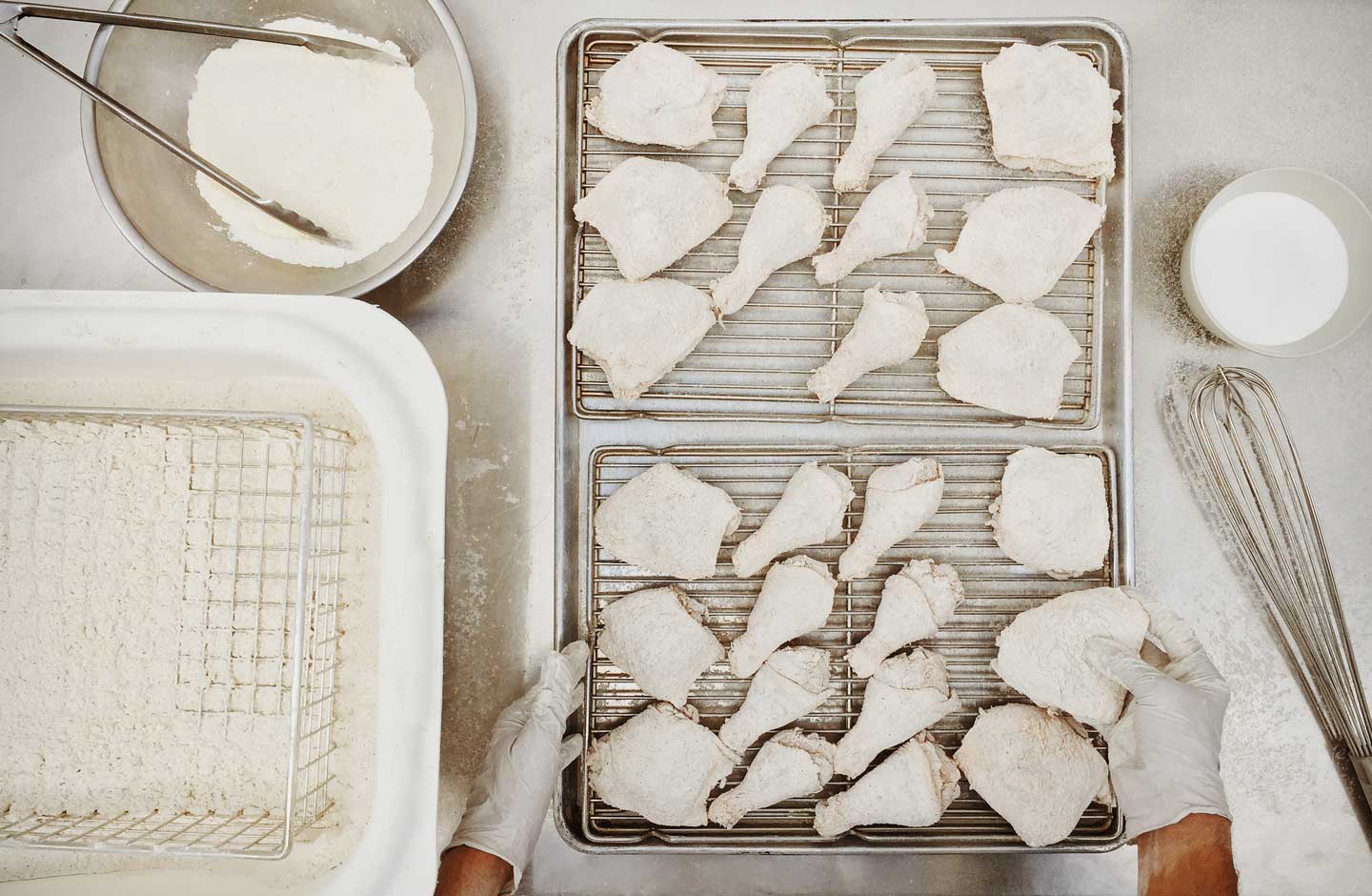 ضعوا قفّازات النايلون في يديك، وابدؤوا في تغليف كل قطعة دجاج جيًّدًا بخلطة التتبيلة من خلال تقليبها مداورة بالطحين، ثمّ تغمّسيها بالماء الدافىء لثلاثة ثوانٍ. صفّوها قليلًا، وغلّفيها من جديد بخلطة التتبيلة (التي تشمل الطحين والبهارات). أعيدوا الكرّة ثلاث مرّات لكي تصبح قطع الدجاج مغلّفة جيّدًا بالطحين.