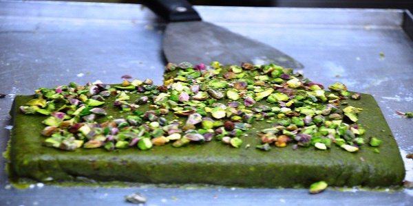 - الخطوة 3: لتحضير عجينة الفستق نطحن الفستق مع القطر ونضيف عليهم فرك الكنافة، ماء الورد وماء الزهر ونمزجهم معاً للتشكّل لدينا عجينة فستك متماسكة