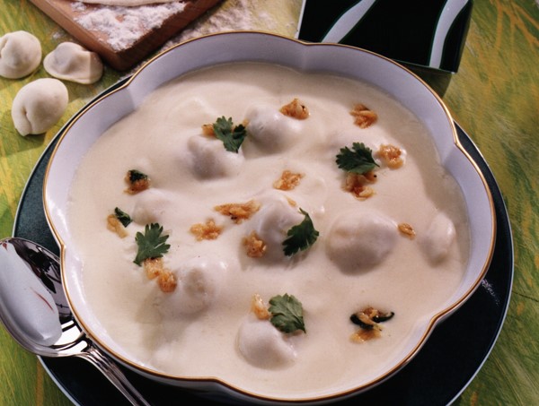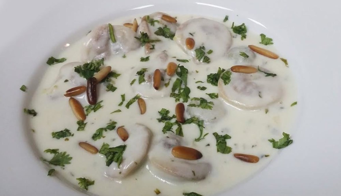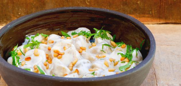 - الخطوة السادسة: نغمس الشيشبرك باللبن في صينية التقديم ويزيّن بالمكسرات والبقدونس والحبق. يقدم مع رزّ بالشعيريّة.