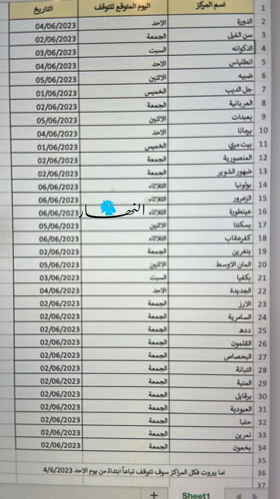 حصلت "النهار" على لائحة السنترالات المهددة بالتوقف تباعاً بحسب التاريخ والتي تضمّ 34 مركزاً يُضاف إليها كل مراكز بيروت التي سوف تتوقف بدءاً من الأحد المقبل.