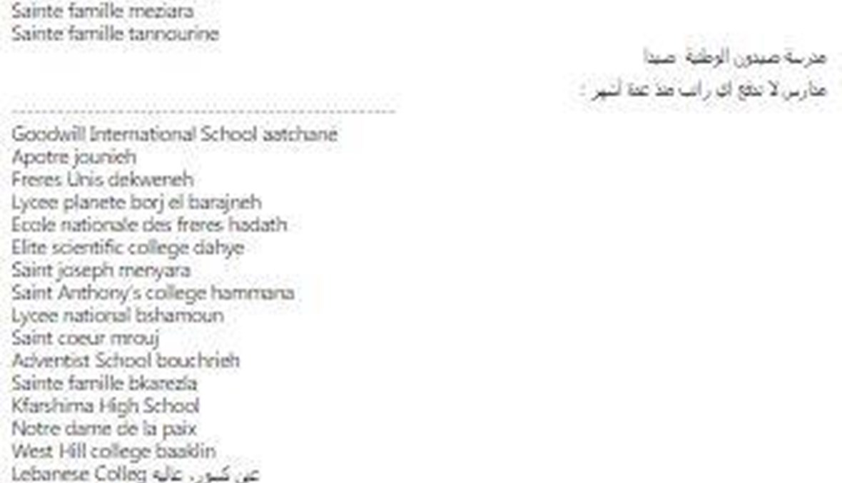 -كذلك، قال مصدر في الأمانة العامة للمدارس الكاثوليكية لـ"النهار" ان "هذه اللائحة ليست رسمية، ومصدرها غير معروف"، مشيرا الى "انها تضمّ اسماء عدد من المدارس التي أعلنت الاقفال العام المقبل".