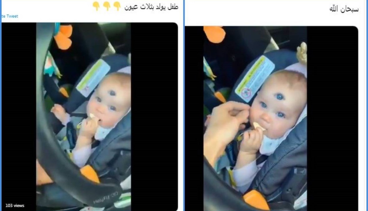الوقائع: بعنوان: "طفل بثلاث عيون"، تكثف تناقل الفيديو منذ أيّام عدة على وسائل التواصل الاجتماعي. المدة: نحو 11 ثانية. ويظهر فيه طفل صغير بثلاث عيون زرقاء، الثالثة على جبينه. وكان يحمل بيده قطعة طعام. وقد ارفق بالمزاعم الآتية (من دون تدخل): "#سبحان_الله طفل بثلاث عيون"، وأيضا "طفل ولد في ألمانيا بثلاث عيون" (في الفيسبوك هنا، هنا، هنا... وتويتر هنا، هنا، هنا...).