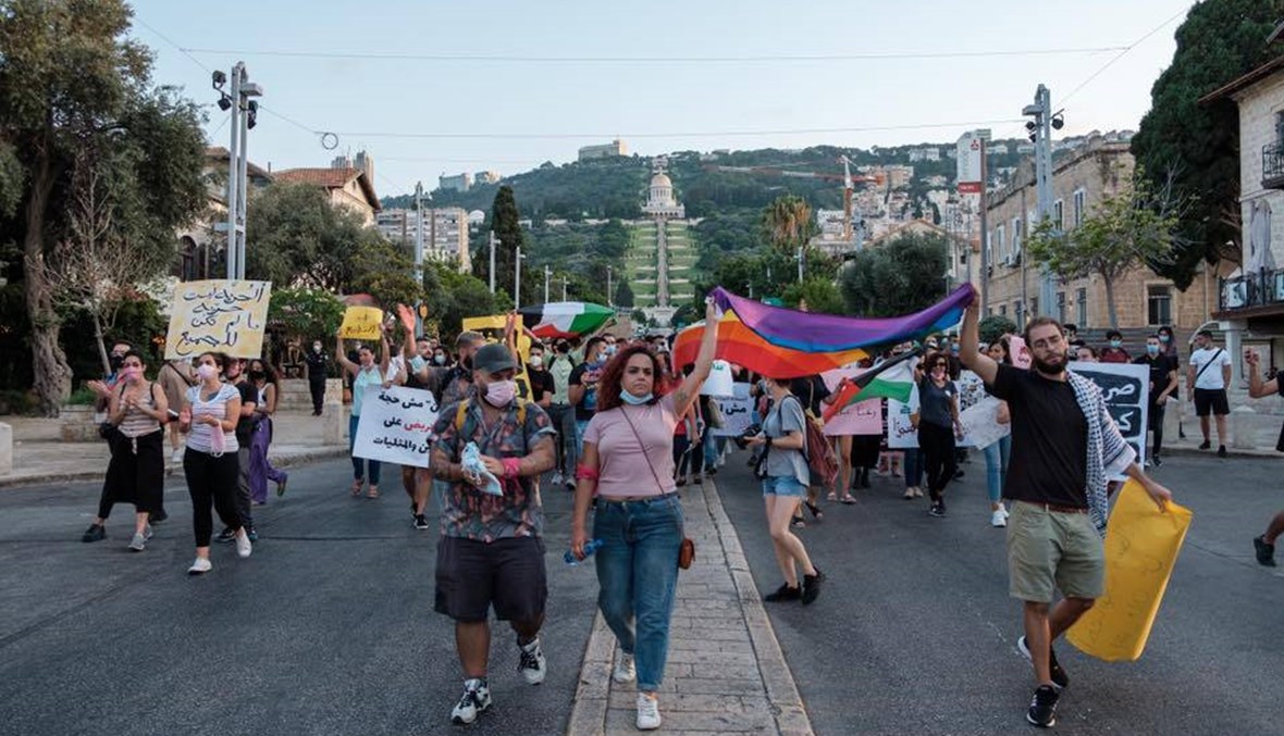 أما في حيفا المحتلة، وتحديدًا من ساحة الأسير، حيث نفذت مسيرة بدعوة من جمعية "القوس للتعددية الجنسية والجندرية في المجتمع الفلسطيني"، تحت شعار "صرخة كويرية للحرية"، رفع خلالها الأعلام الفلسطينية وعلم "قوس قزح"، بالإضافة إلى شعارات تطالب بوقف العنف الممارس بحقهم.