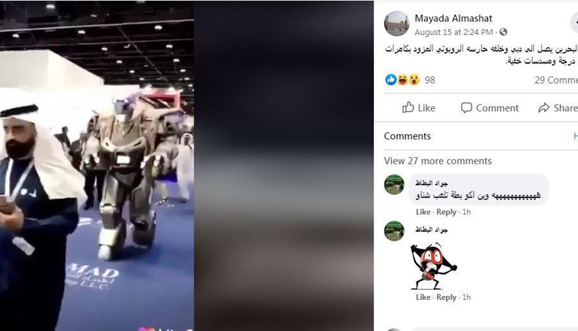 بخطوات واثقة، كان الروبوت الضخم، بعينين زرقاوين، يمشي في المكان. فيديو تكثف تناقله على نطاق واسع في وسائل التواصل الاجتماعي، مرفقا بمزاعم ان "ملك البحرين يصل الى دبي برفقة حارسه الشخصي الروبوت المزود بـ360 كاميرا ومسدسا مبرمجة". غير أنّ هذه المزاعم لا صحة لها. الفيديو يظهر الروبوت الشهير تيتان Titan خلال مشاركته في معرض الدفاع الدولي "آيدكس" في أبو ظبي في شباط 2019. FactCheck#