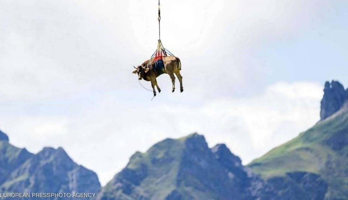 في مشهد بدا غريباً ونادراً، انتشرت صورة لبقرة معلّقة في الهواء تحملها طائرة مروحية في جبال الألب بسويسرا في مواقع التواصل الاجتماعي.