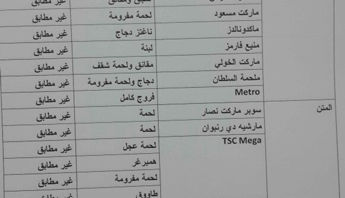 - سوبر ماركت فهد لحمة مفرومة غير مطابق، كفته غير مطابق، همبرغر غير مطابق، شاورما لحمة غير مطابق.