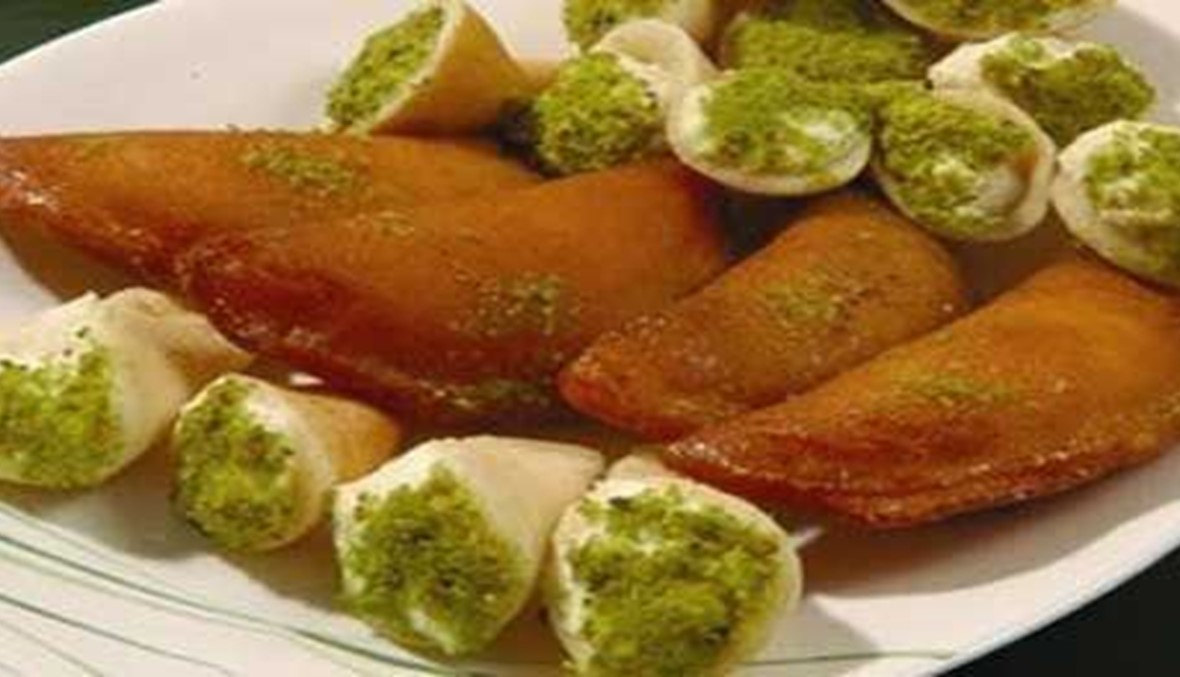 - القطايف المحشية قشطة تقدم مع القطر، وتزين بالفستق ومربى الليمون.