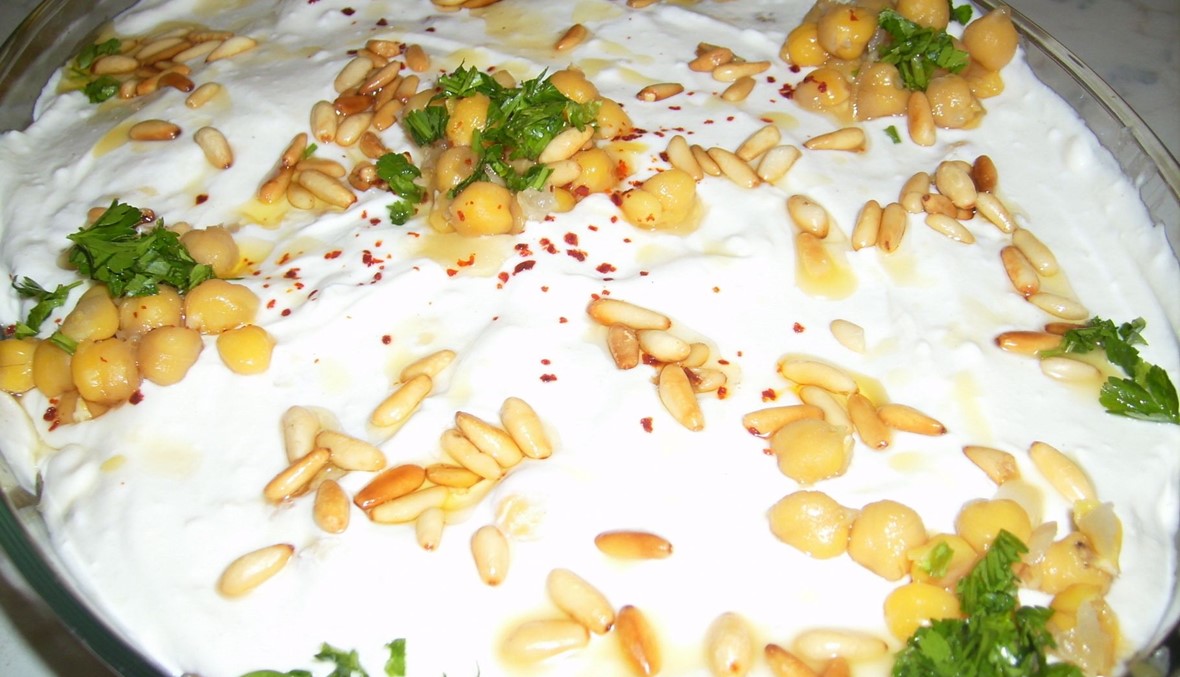 وزّع اللبن على الخبز وضع الباذنجان المقلي فوقه، ثم اللحم المفروم، بعد ذلك انثر الصنوبر والبقدونس وقدّم الطبق.
