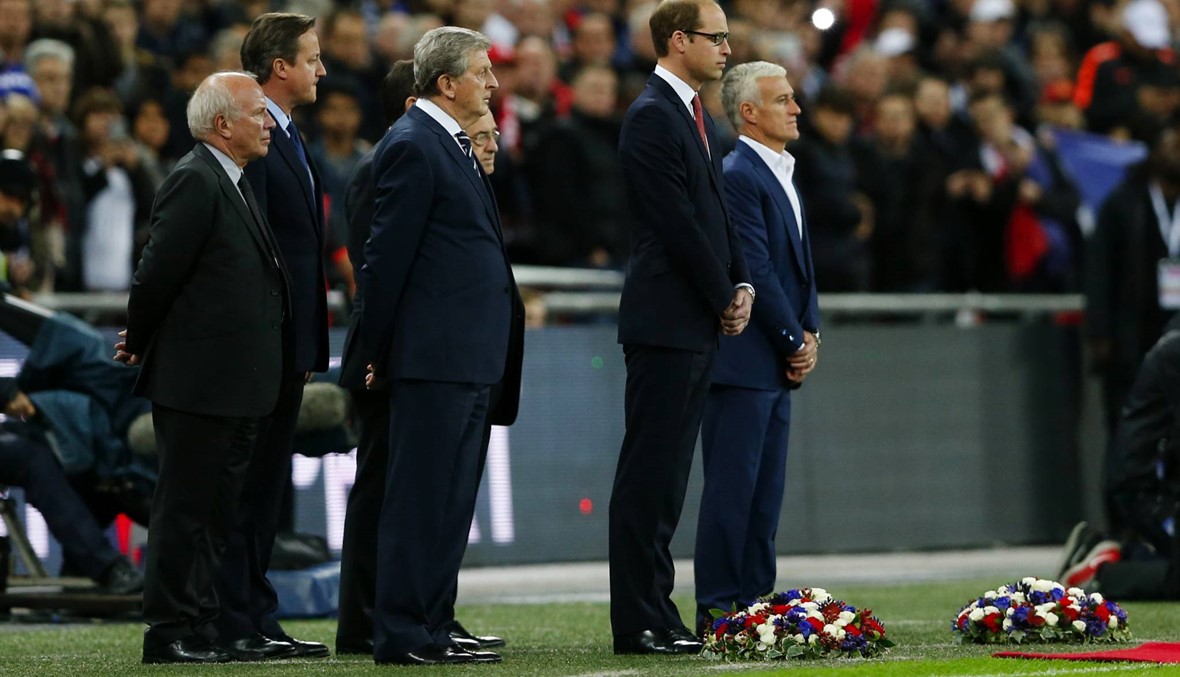 وأنشد الجميع "المارسييز"، ونزل رئيس الوزراء البريطاني ديفيد كاميرون الى الملعب ووضع الامير وليم ومدرب منتخب فرنسا ديدييه ديشان باقتين من الزهر إحياء لذكرى أرواح ضحايا اعتداءات باريس.