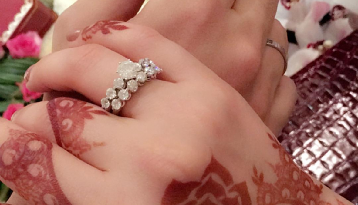 العروس نشرت ايضا في حسابها عبر "انستغرام"، صورة وهي تضع يدها بيد العريس، كاشفة عن خاتم زواجها وعلقت قائلة: "الليلة قلبي صار بأمرك".