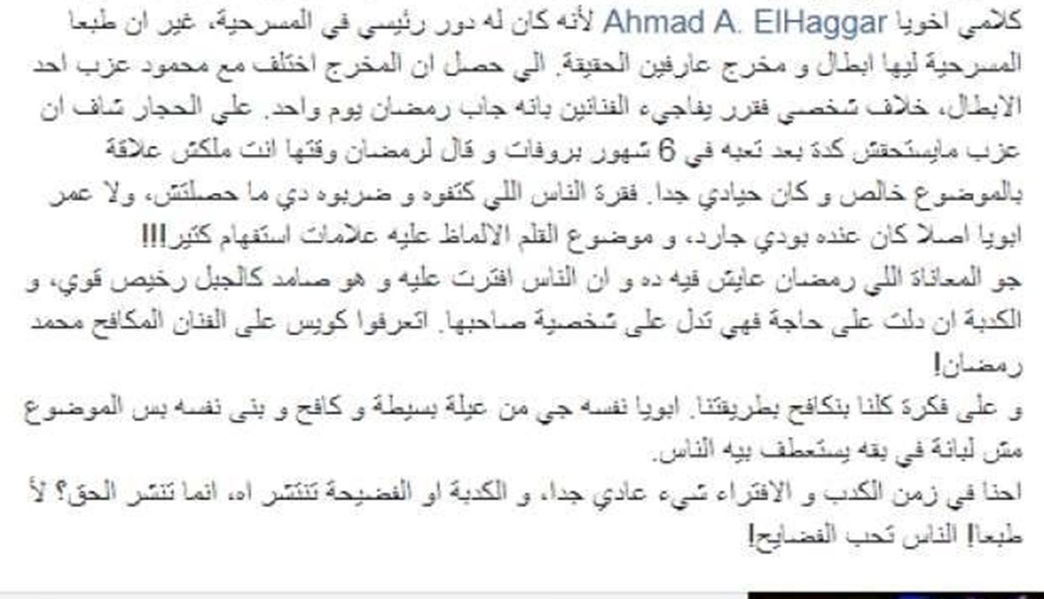 وكتبت شهيرة عبر حسابها في "فايسبوك": "أبويا عمره ما رد، وكان شايف إن الموضوع مش مستاهل يترد عليه، وأنا الصراحة مستغربة جداً هو إزاي بيحكيها بثقة أوي كده وجاب الخيال ده منين؟!"، متابعة: "اللي حصل إن المخرج اختلف مع محمود عزب أحد الأبطال، خلاف شخصي، فقرر يفاجئ الفنانين بأنه جاب رمضان يوم واحد، وعلي الحجار شاف إن عزب مايستحقش كده بعد تعبه في 6 شهور بروفات وقال لرمضان وقتها أنت ملكش علاقة بالموضوع خالص وكان حيادي جداً".