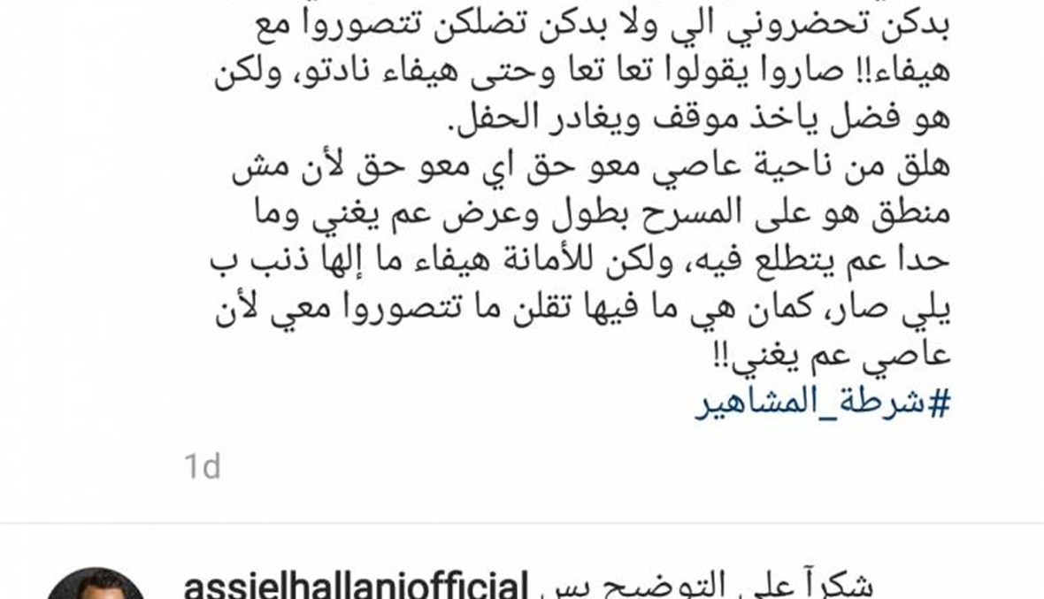 "شرطة المشاهير" أعادت نشر الفيديو وأرفقته بتفسير لحقيقة ما جرى، مشيرة إلى أنّ سبب انسحاب الحلاني كان انزعاجه من انشغال الحضور بالتقاط الصور مع وهبي وعدم التفاعل معه وهو معتلٍ خشبة المسرح، إذ توجّه إليهم قائلاً: "بدكم تحضروني إلي ولّا بدكن تضلكم تتصوّروا مع هيفا"، لينسحب بعد هذه الكلمات، وسط هتافات الهراوي وصعب وحتى وهبي. ولأنّ الفيديو بدأ التداول فيه على مواقع التواصل الاجتماعي في شكل واسع، كتلميح إلى وجود خلاف بين الحلاني ووهبي، اختار الحلاني أن يصدر توضيحاً من خلال الردّ عبر الفيديو الذي نشرته "شرطة المشاهير" وقال: "شكراً للتوضيح، لكن هذه الخبرية عمرها 10 سنوات، وفي كل الأحوال هيفا حبيبة قلبي وعدنا والتقينا أكثر من مرة في حفلات ومهرجانات، ولا يوجد بيني وبينها إلا كل خير".