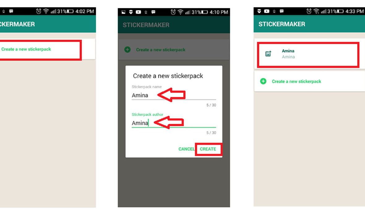 - سيتطلب منك إدخال اسم لحزمة الملصقات sticker pack name واسم من قام بعمل الجزمة sticker pack author، ثم ستضغط على خيار إنشاء Create