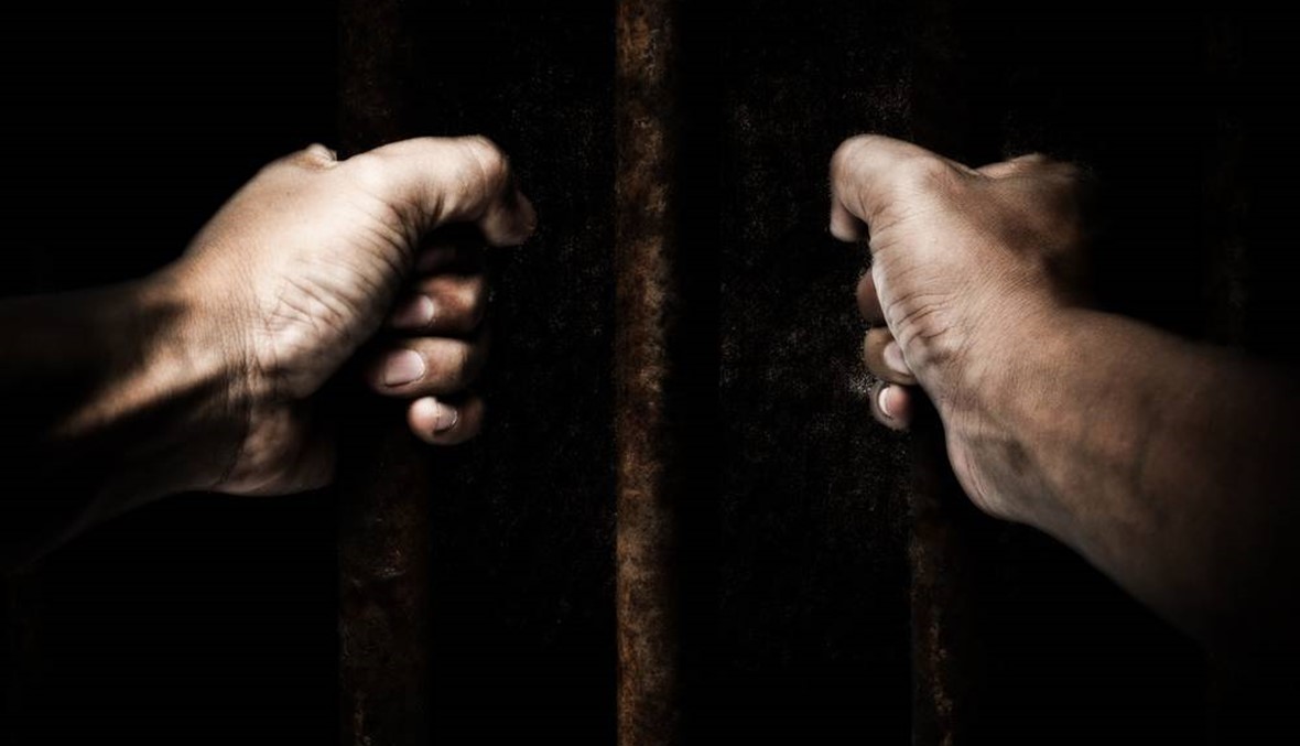 تظهر الصورة رجلاً معصوب العينين، مقيداً بكرسي يشبه قفصاً، في غرفة رفع فيها العلم الايراني.