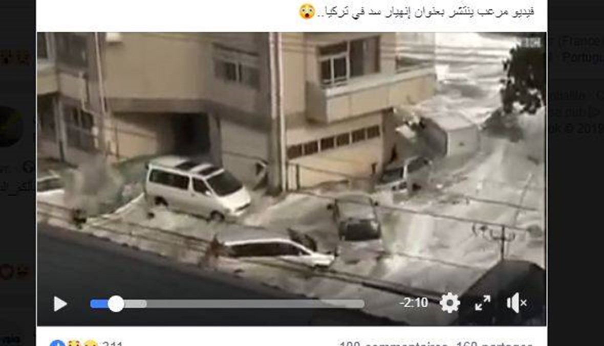-هذا الفيديو يصوّر تعرّض احدى المدن الساحلية اليابانية للتسونامي، في 11 آذار 2011، وليس كما يزعم البوست انه يصوّر انهيار سد في تركيا. الفيديو سبق ان نشرته يومذاك، على "اليوتيوب"، قنوات تلفزيونية عالمية، بينها هيئة الاذاعة البريطانية (بي بي سي)، وChannel 4 News البريطانية، وايضا CBS وCNN الاميركيتان.