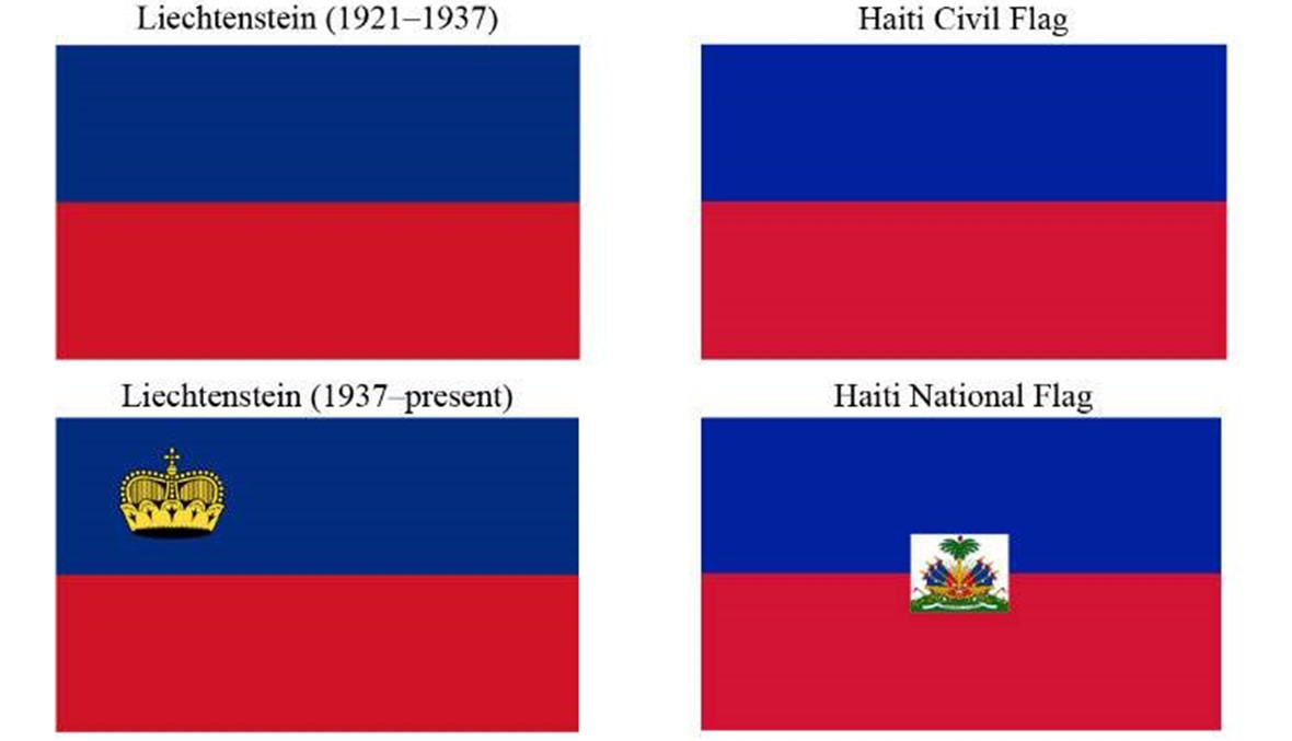 لم يقتصر الأمر في تشابه الأعلام على ليختنشتاين وهايتي فقط، فكل من إندونيسيا وبولندا وموناكو لديها العلم نفسه، وهو مكوّن من اللونين الأبيض والأحمر، وإن كان علم بولندا يختلف عن الدولتين الأخريين في كون اللون الأبيض يعتلي الأحمر. ويعتبر البعض ان علم "غرينلاند" أيضاً مشابهاً لعلمهما.