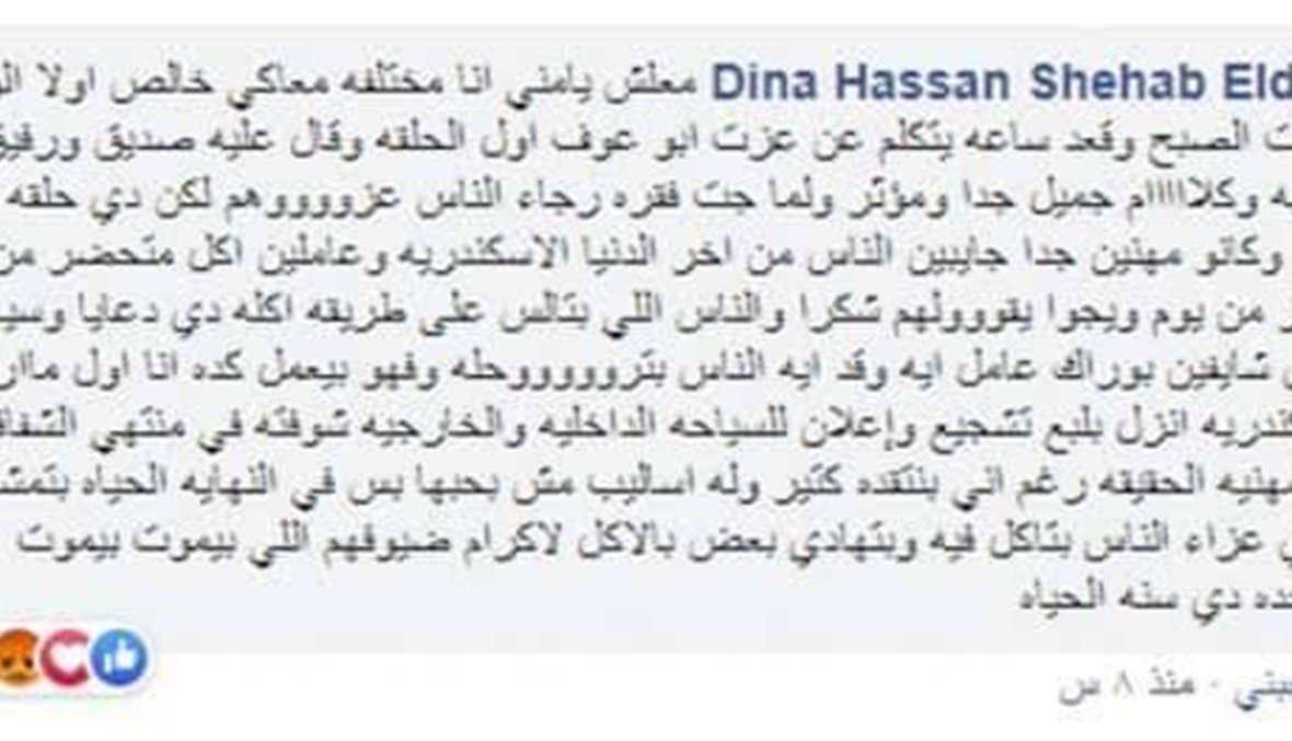 وكتبت منى في "فايسبوك": "جدير بالذكر أنه يوم وفاة عزت أبوعوف، صديق ورفيق برنامج عمرو أديب ورجاء الجداوي، على مدار سنين كتير أوي... وبدل ما تبقى حلقة خاصة لصديقهما ورفيق عمرهما... كانت حفلة أكل!"، فيما قال محمد: "أصبحنا في زمن لا وفاء ولا إنسانية ولا رحم ولا أخلاق كلها شعارات كدابة والله يرحم الجميع ياللا نفسي".