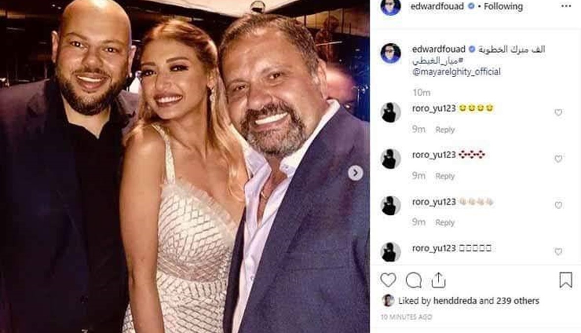 كشف الفنان إدوارد عن خطوبة الفنانة الشابة ميار الغيطي، بعد تكتم الأخيرة عليها، حيث بارك إدوارد الخطوبة عبر "إنستغرام"، ونشر صوراً له معها، معلّقاً: "ألف مبروك الخطوبة ميار الغيطي"، وهي الخطوبة التي حضرها عدد كبير من الفنانين أبرزهم مي سليم ودانا حمدان وأمل رزق.
