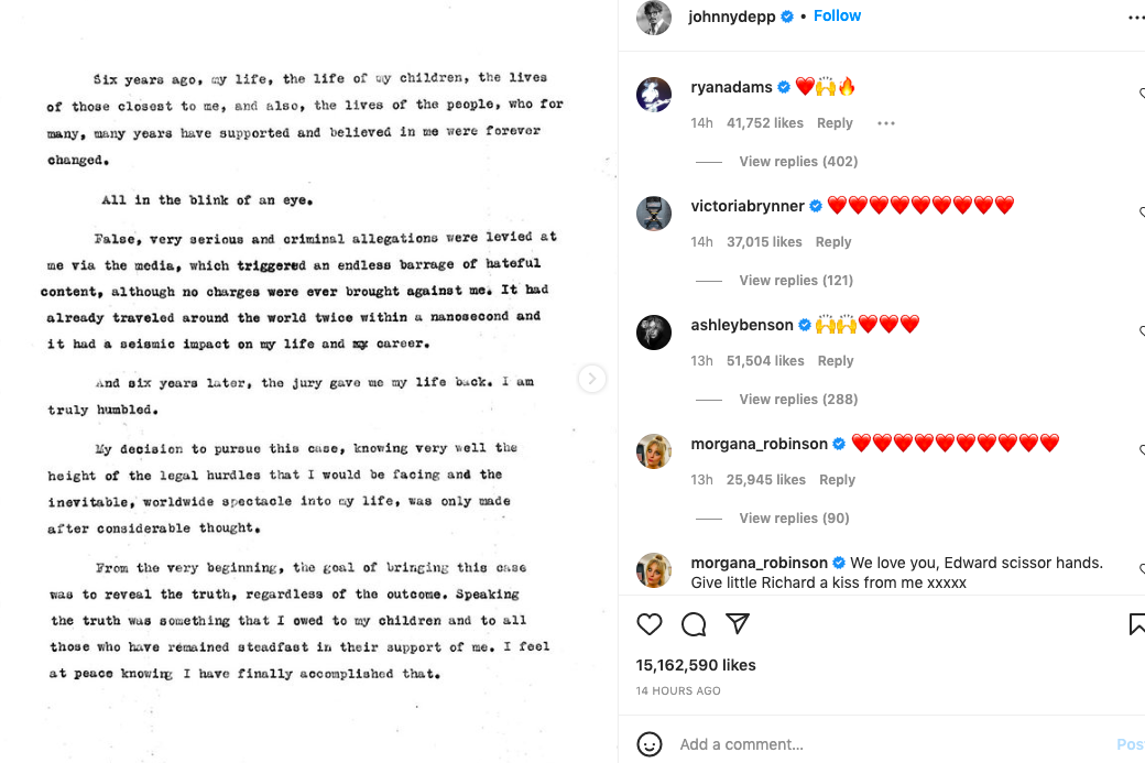 وعبّر الموسيقي ريان آدامز والنجم هاري جوسي وعدد كبير من المشاهير حول العالم عن دعمهم الكامل لجوني ديب من خلال عدد من الرموز والقلوب على منشور بيان ديب عبر "إنستغرام" الذي كتب فيه أن "الحياة عادت إليه" بعد صدور الحكم لصالحه.