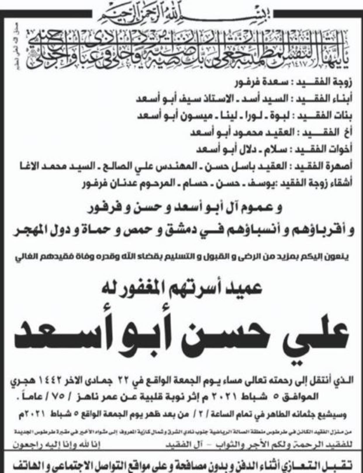 وأوضحت نعوة الفقيد علي حسن أبو أسعد أنّ المنية وافته عن عمر ناهز 75 عاماً إثر نوبة قلبية حادة، وأنّ مراسم الدفن والعزاء تمت بتقيّد تام بالإجراءات الوقائية والتباعد الاجتماعي المفروض في ظلّ تفشي فيروس كورونا.