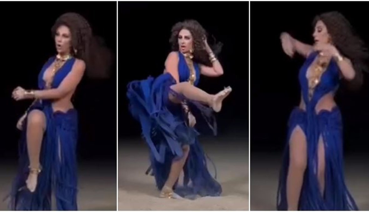 وأطلت الفنانة اللبنانية في لوحات راقصة في الكواليس بزيّ باللون النيلي أشبه بفساتين الرقص الشرقي.