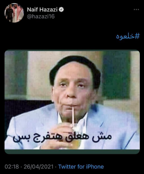 ونشر هزازي تعليقاً على خطوة خطيبته السابقة صورة من أحد مشاهد النجم المصري عادل إمام معلقاً بوسم (هاشتاغ) "خلعوه".