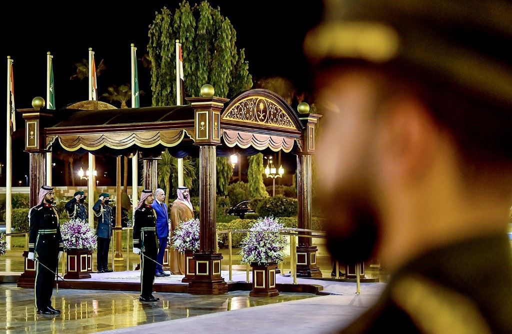 الحرس السعودي خلال استقبال ولي العهد رئيس الوزراء العراقي (أ ف ب).